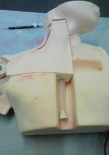 彼は練習台さん(名前を聞いてくるのを忘れた)彼なら、麻酔をかけなくても、いたくな~い。失敗しても、肺に穴があかな~い。動脈をついてもOK!という優れ物ヽ(´▽`)/ただし、彼の寿命は短いです(´∀`)そして、針にゲルがつまります(;^_^A